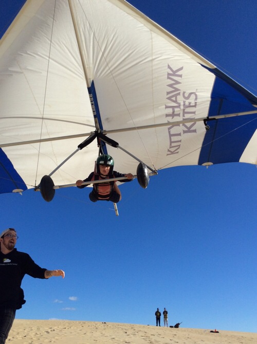 From Washington DC and the original Wright brothers Flyer plane, complete with compelling descriptions and interactive Smithsonian stuff all around it, we’re now at Kitty Hawk, the sand dunes where Orville and his brother flew their first plane on a sand bar. We even managed to get hangliding at the spot the brothers first flew and met Chicago’s most talented airman, who made us laugh all afternoon and was the best company, thank you Will……..